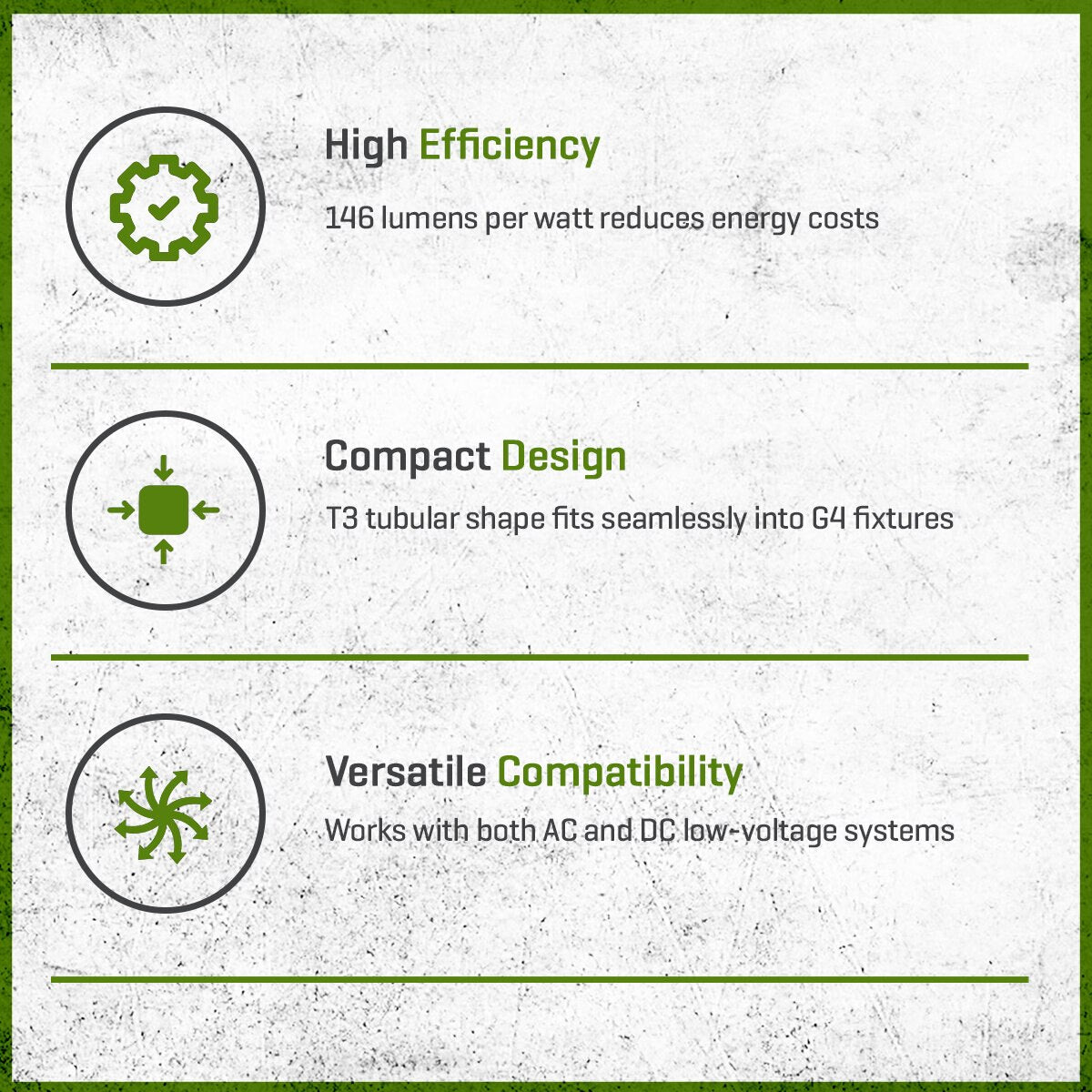 Enjoy warm, efficient, and reliable accent lighting with the Flex Gold LED, 1 WATT, T3 3000K. Designed to deliver crisp, warm white light while consuming minimal energy, this lamp ensures your landscape or interior accents shine with elegance. With a long 50,000-hour lifespan and a compact tubular design, it fits seamlessly into standard G4 sockets and brings you consistent illumination backed by superior durability.