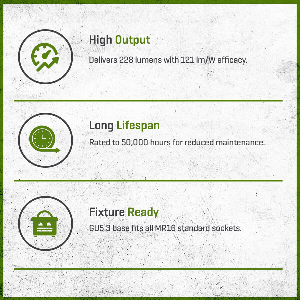 Built for durability, it features advanced thermal management with a patent-pending heat sink, ensuring long life even in enclosed fixtures. Rated to 50,000 hours, it offers dependable performance with reduced maintenance. Its GU5.3 base ensures easy compatibility with standard MR16 fixtures for both indoor and outdoor architectural applications. With its blend of efficiency, precision, and longevity, this lamp delivers a refined lighting solution for residential or commercial spaces.