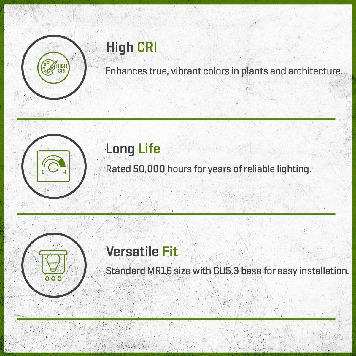 With its compact MR16 size, the lamp is compatible with standard GU5.3 sockets, making it easy to upgrade existing systems to energy-saving LED performance. Rated for 50,000 hours, this lamp minimizes maintenance while maximizing long-term value. From outdoor landscapes to indoor accents, the FLEX GOLD LED 3W Spot offers the perfect balance of efficiency, durability, and beautiful illumination.