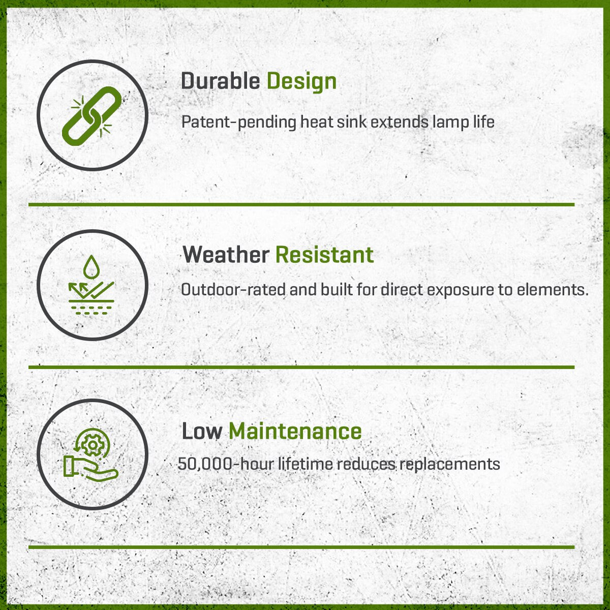 Built to withstand the elements, the FLEX GOLD LED features a durable heat sink design for long-lasting performance and reliability. It offers consistent light output, high efficacy, and compatibility with low-voltage landscape lighting systems, making it a versatile choice for driveways, patios, decks, and under-canopy tree lighting up to 20 ft. With a long-rated life of 50,000 hours, this lamp ensures years of dependable performance with minimal maintenance.
