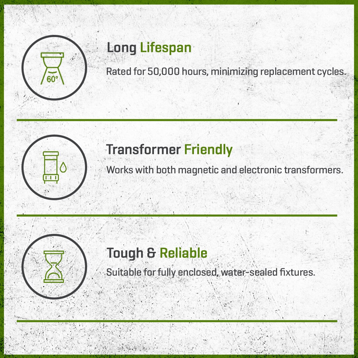 Built for versatility, the lamp operates on 9–24V AC/DC systems and is compatible with both magnetic and electronic transformers. Its advanced heat sink design maintains cool operation, extending the life of the lamp up to 50,000 hours. Fully enclosed fixture compatibility, robust water sealing, and a durable MR16 standard size make it a reliable choice for outdoor landscapes, interior architectural lighting, and security applications. With the FLEX GOLD LED, you achieve professional-grade illumination while lowering energy costs and maintenance needs.