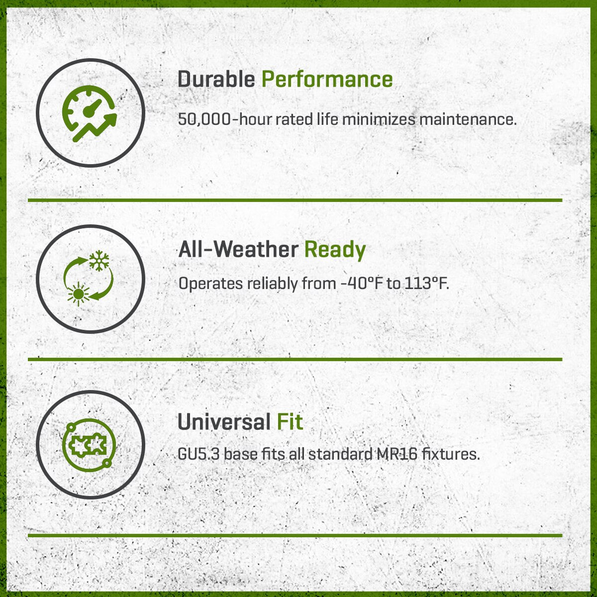Engineered to fit standard MR16 fixtures with a GU5.3 base, the FLEX GOLD LED is compatible with both AC and DC low-voltage systems, making it versatile for outdoor and indoor applications. Rated for 50,000 hours, this LED lamp provides confidence and energy savings without compromising on quality. Whether you’re enhancing landscapes, increasing safety, or accentuating architecture, this lamp offers dependable illumination and refined aesthetics.
