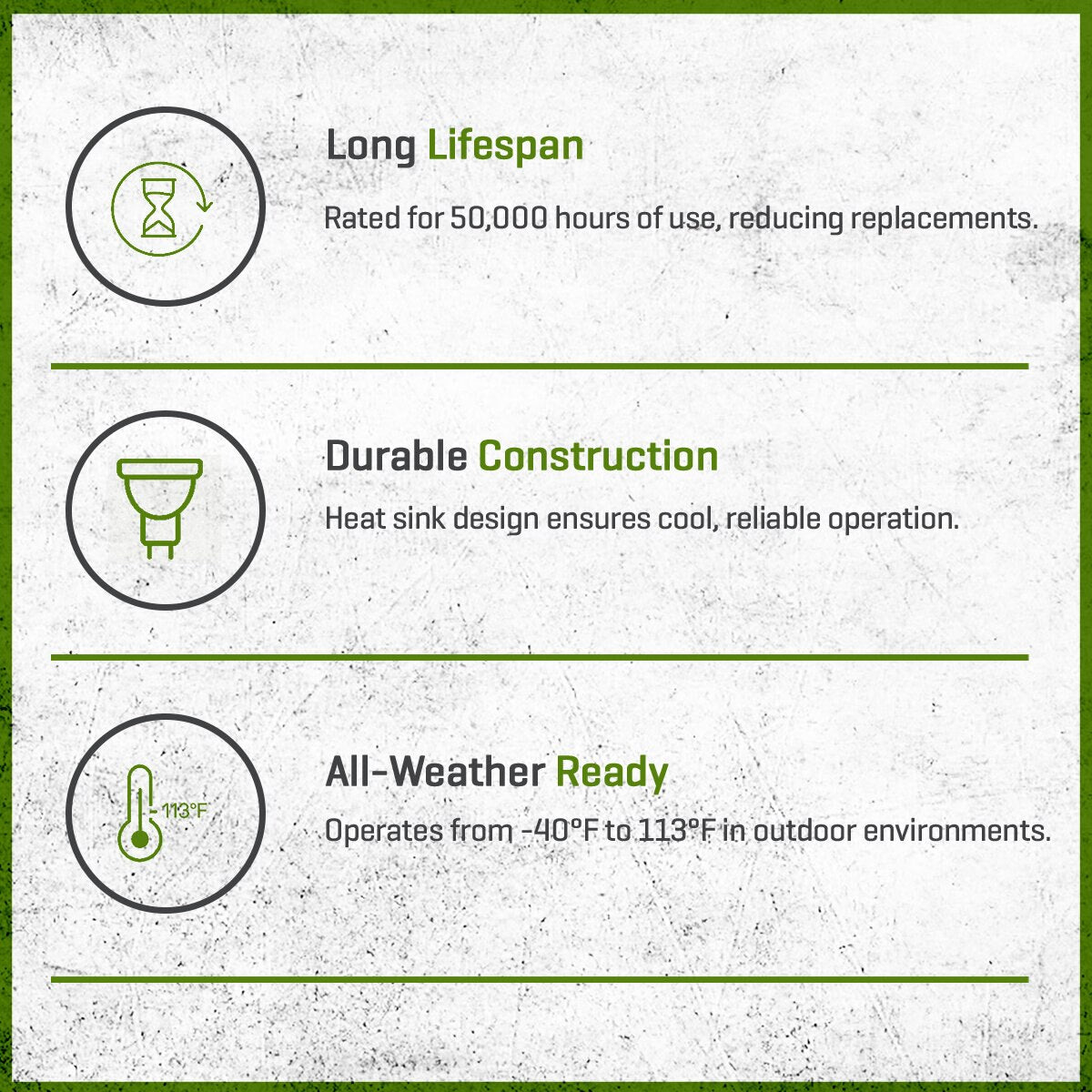 The lamp features a robust GU5.3 base, advanced heat sink design for cool operation, and compatibility with low-voltage AC/DC landscape systems. With a wide 60° beam angle and lumen output of 626, it ensures superior coverage, safety, and ambience. Its 50,000-hour rated lifespan make it a worry-free solution for residential and commercial applications.