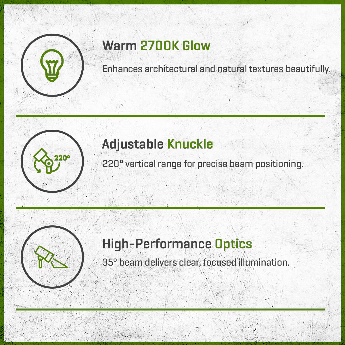 Equipped with a high-performance 2700K LED lamp, this up light offers warm illumination with superior beam consistency. The 35° beam angle allows for targeted accenting, while its ProAim adjustability gives designers full flexibility to create custom lighting effects. A 40,000-hour rated lamp life ensures dependable performance, while compatibility with Luxor technology allows zoning and dimming for advanced lighting control. With easy installation features, robust construction, and a professional finish, this fixture is both functional and stylish.