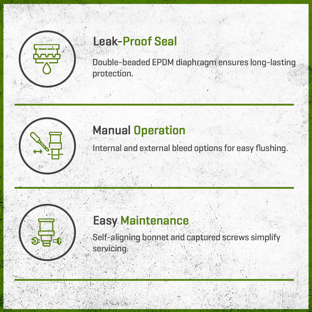 Designed with a rugged, double-beaded EPDM diaphragm, the valve delivers a long-lasting, leak-proof seal. The corrosion-resistant PVC and stainless-steel construction ensure dependable service life, while internal and external bleed features allow quick manual operation without flooding the valve box. A self-aligning bonnet and captured screws make maintenance straightforward, minimizing downtime in the field.