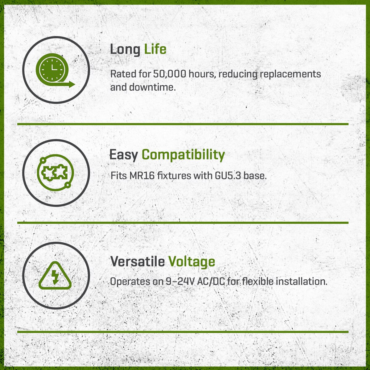 Built with advanced optics, it produces a wide 45° flood beam that spreads warm 2700K light evenly, making it ideal for enhancing gardens, patios, and architectural features. The lamp’s GU5.3 base ensures easy compatibility with standard MR16 fixtures, while its rugged design is suitable for fully enclosed, water-sealed housings. Rated for 50,000 hours of life, it provides long-lasting reliability in both residential and commercial applications.