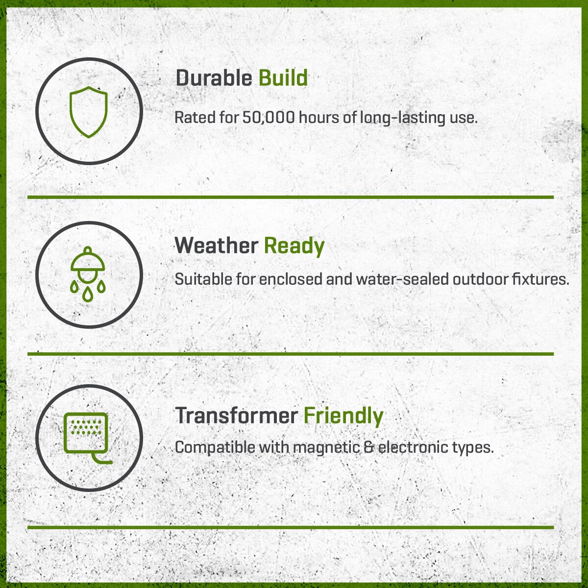 Built for lasting performance, it produces 250 lumens at just 2 watts with high efficacy, providing both brightness and efficiency in one compact design. Its G4 base ensures compatibility with a wide range of indoor and outdoor fixtures, while its superior water protection and suitability for enclosed fixtures make it ideal for landscape and architectural applications. Rated for 50,000 hours of use, it reduces maintenance while ensuring years of reliable operation.