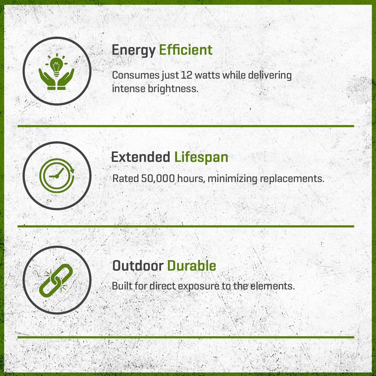 Deliver powerful, energy-efficient illumination with the FLEX GOLD LED, 12 Watt, PAR36 Flood, 3000K lamp. Designed for high-output performance, this lamp produces up to 1220 lumens with a warm 3000K color temperature that enhances landscapes, architecture, and outdoor living spaces with vibrant, natural light. Its robust construction, advanced heat sink design, and weather-resistant build ensure long-lasting reliability even in demanding environments. Whether used to uplight mature trees, accentuate walls, or brighten expansive patios, this lamp provides professional-grade performance with remarkable energy savings.